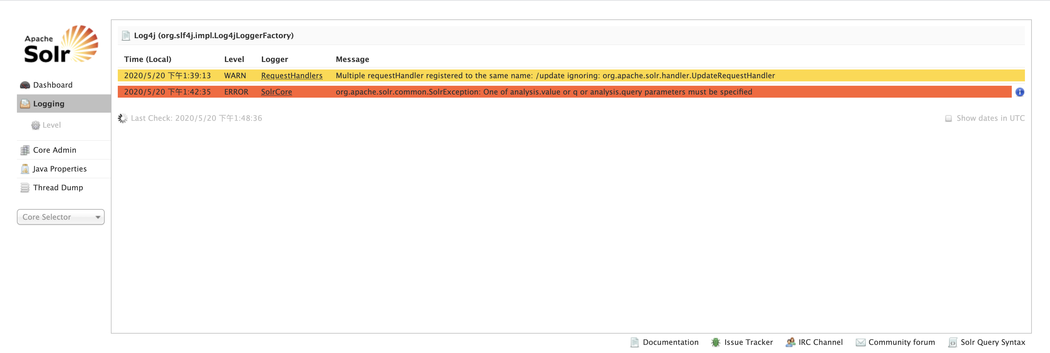 solr 服务器管理界面可以查看系统状态、solr设置、分词检测、查询索引、增减core、查看日志等
