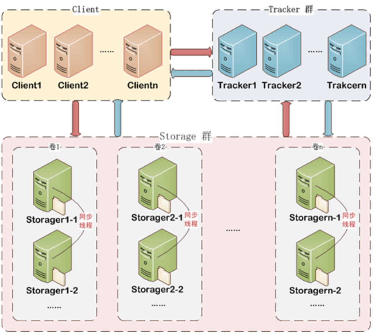 Storage集群采用了分组存储方式。storage集群由一个或多个组构成,集群存储总容量为集群中所有组的存储容量之和。一个组由一台或多台存储服务器组成,组内的Storage server之间是平等关系,不同组的Storage server之间不会相互通信,同组内的Storage server之间会相互连接进行文件同步,从而保证同组内每个storage上的文件完全一致的。一个组的存储容量为该组内存储服务器容量最小的那个,由此可见组内存储服务器的软硬件配置最好是一致的。