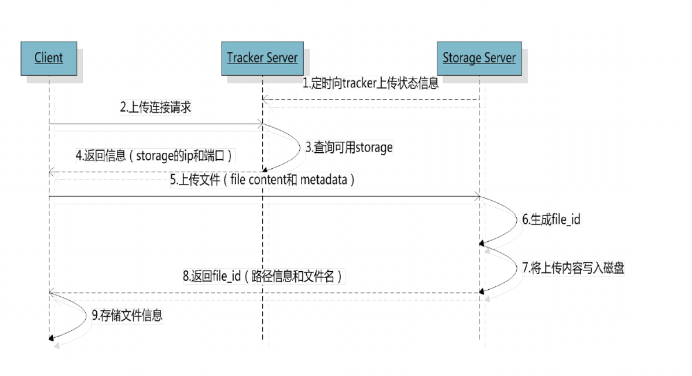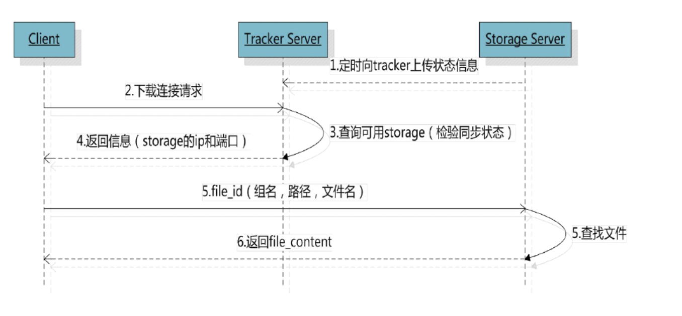 Storage server会连接集群中所有的Tracker server,定时向他们报告自己的状态,包括磁盘剩余空间、文件同步状况、文件上传下载次数等统计信息。