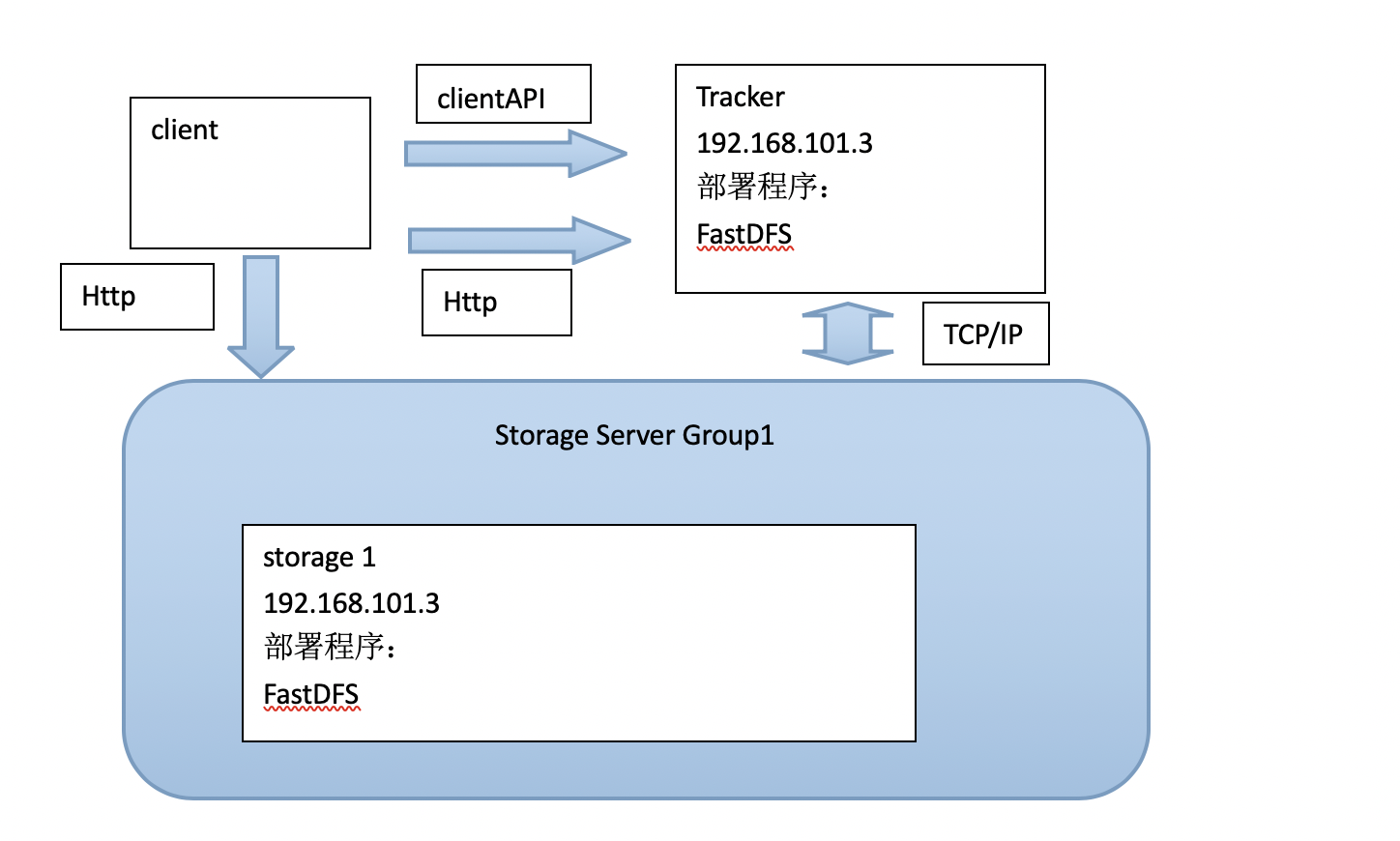 FastDFS架构包括 Tracker server和Storage server。客户端请求Tracker server进行文件上传、下载,通过Tracker server调度最终由Storage server完成文件上传和下载。